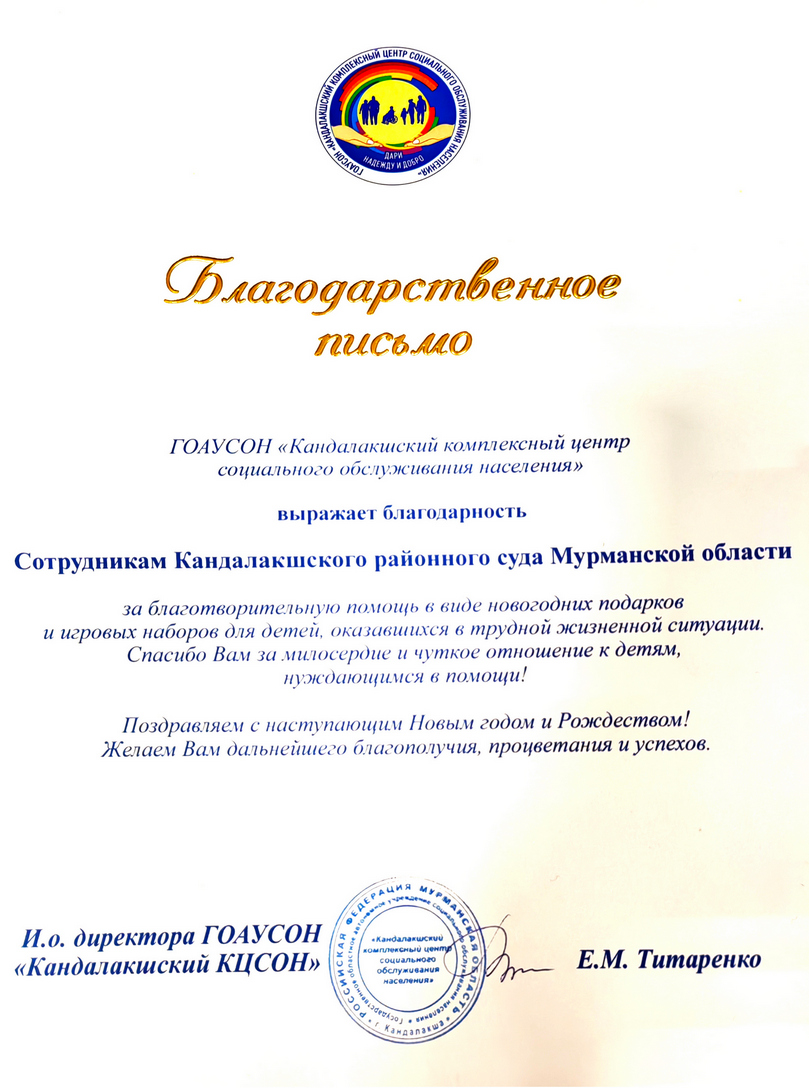 Новый год – время исполнения желаний, особенно для детей, которым не хватает заботы и внимания. В Кандалакшском районном суде Мурманской области в преддверии главного зимнего праздника была проведена традиционная благотворительная акция для детей, находящихся в отделении для несовершеннолетних, нуждающихся в социальной реабилитации ГОАУСОН «Кандалакшский комплексный центр социального обслуживания населения». Встреча с детьми прошла в праздничной и дружной обстановке, сотрудники суда совместно с ребятами приняли участие в командной новогодней викторине. имени судей и сотрудников аппарата Кандалакшского районного суда Мурманской области детям передали сладкие подарки и игровые комплексы. Руководство ГОАУСОН «Кандалакшский комплексный центр социального обслуживания населения» поблагодарило Кандалакшский районный суд Мурманской области за оказанное внимание и отзывчивость, вручив Благодарственное письмо.